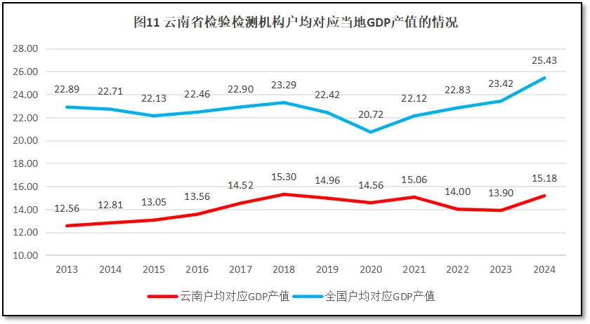 由图12可见,过去12年,云南省检验检测机构户均对应的人口数量逐年下降,但云南的数据一直低于全国平均数。云南省检验检测机构从2013年的户均对应4.55万人,下降到2024年的2.24万人左右。从人口数量的对比值来看,云南省检验检测机构数量显得很多,从检验检测机构户均对应当地GDP值来看,也显得多了一点。这说明云南省经济状况一般,人口也不多,但检验检测行业发展过热,已经超出了云南省经济建设和社会发展的正常需求。