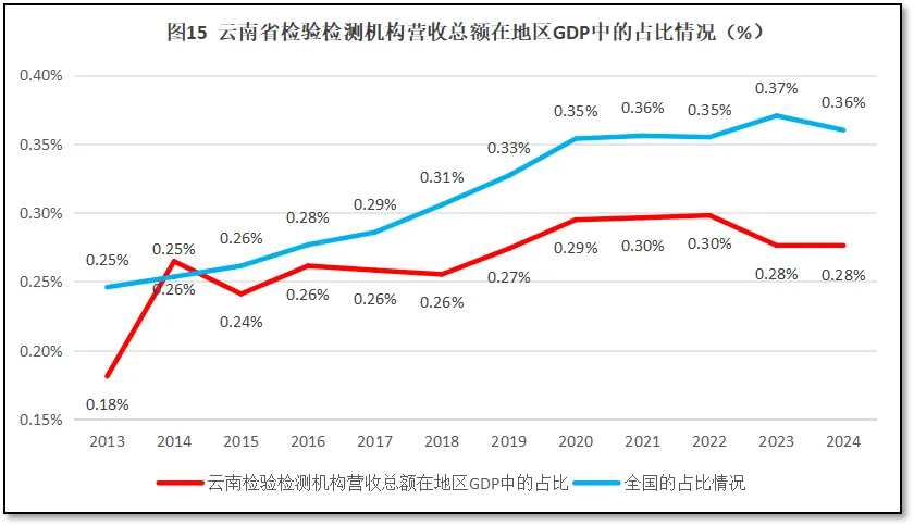 再来看云南省检验检测机构营收总额在其地区生产总值GDP中的占比情况。2024年度,云南省检验检测机构营收总额86.89亿元,占当年云南省GDP值的0.28%,远低于全国平均值0.36%的水平,排名全国第21(由高到低排序),处于全国靠后位置,但排名比2023年度提升了1位。过去12年云南省检验检测机构营收总额在当地GDP值的比例变化情况,如图15所示。