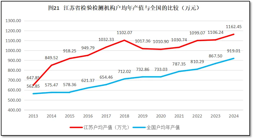 由图20可见,在2021年之前,云南省检验检测机构户均年产值总体保持增长,但2021年之后开始下降,2024年才止跌回升,户均年产值为418.14万元,是2013年的1.84倍。从增长率的曲线来看,除了头两年数据误差大显得增长率很高之外,从2015年到2021年,云南省检验检测机构户均年产值的年均增幅为4.14%,增长较为平稳。但到了2022年和2023年均降为负值,说明这两年云南省检验检测机构的经营比较困难。2024年云南省检验检测机构户均年产值增长率反弹较大,增长率达到8.93%。