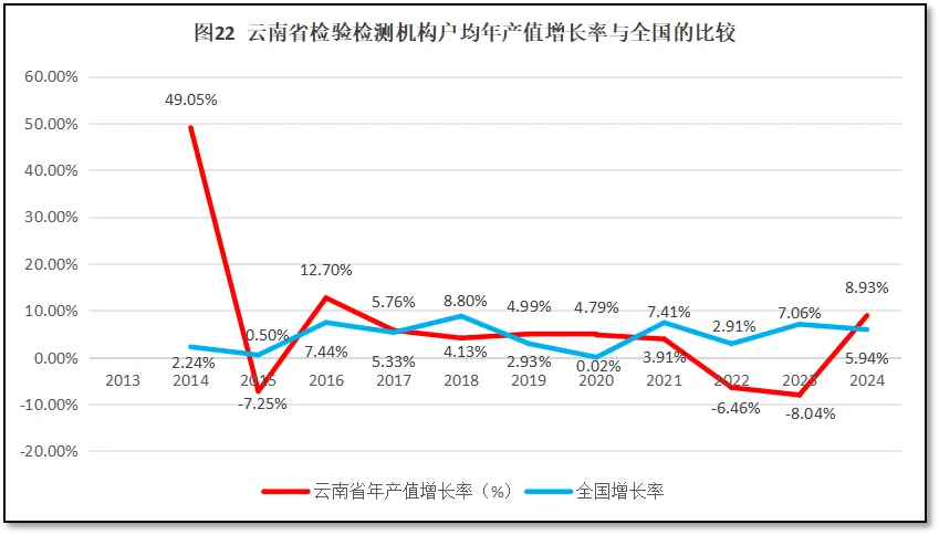 由图19可见,云南省检验检测机构人均年产值增长率与全国检验检测机构人均年产值增长率的变化规律差异较大。2015年,云南省检验检测机构人均年产值跟全国一样,都出现了一个下降的低谷值,但云南省的低谷远比全国的平均数更低,达到了-7.89%。此后,云南省的增长率开始提高,2016年云南省出现第一个增长高峰时,增长率值比全国平均数高出5个百分点。在2018年全国检验检测行业出现营收总额增长高峰时,云南省的增长率一般,直到2019年云南才出现第二个增长高峰。而此时全国的增长率已经开始下降。2021年之后,全国检验检测机构人均年产值还保持着波动增长的时候,云南省检验检测机构的人均年产值增长率一路走低,在2023年与全国平均数相差10个百分点,且为负增长。2024年,云南省出现较大的反弹,人均年产值增长率高于全国平均数。总的来看,云南省检验检测行业发展质量与全国的差距存在拉大的趋势,2024年云南出现的“机构数量减少、人均产值提高”的现象,有可能扭转这种趋势,带动云南省检验检测行业迎来新的发展。