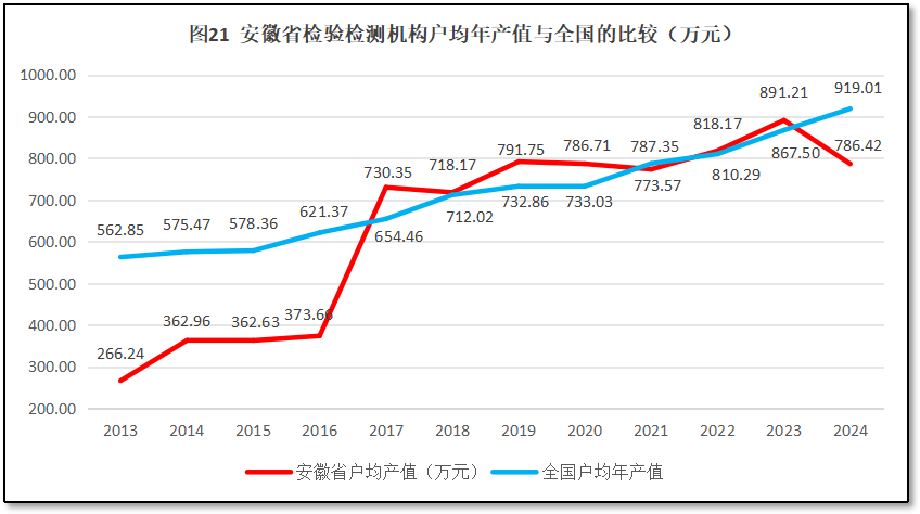 安徽省检验检测机构人均年产值与全国的情况比较如图18所示。